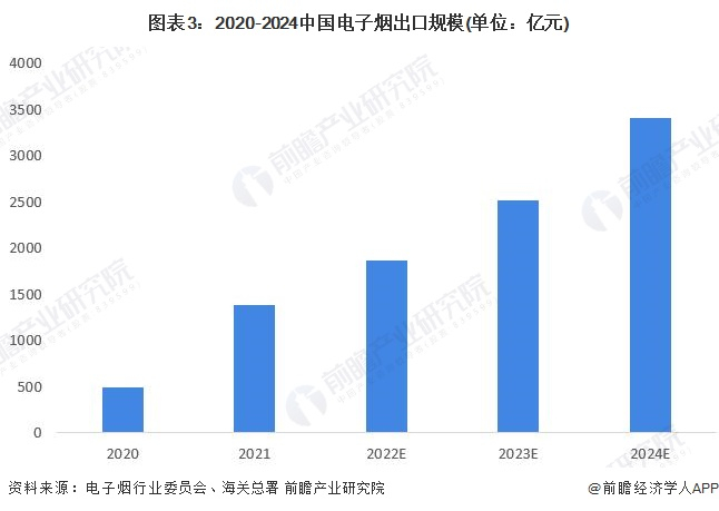 相较于全球800亿美元的市场规模,我国电子烟消费市场还较小。海外庞大的电子烟消费市场带动了国内电子烟的生产与出口,我国约90%的电子烟用于出口,数据显示,2021年中国电子烟产业出口约1383亿人民币,同比增长180%。预计这一出口规模还将不断增长,到2024年出口额将达到3402亿元。