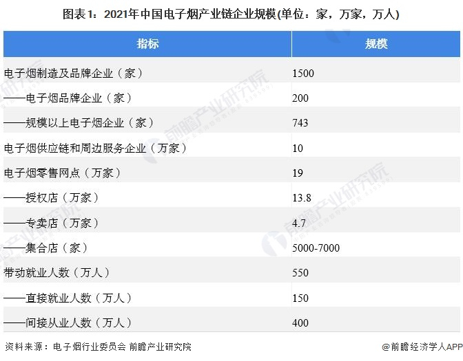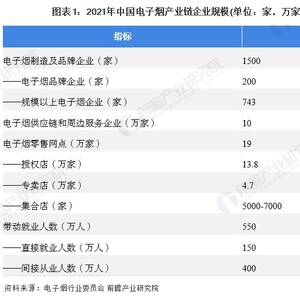 电子烟是指产生含烟碱(尼古丁)的气溶胶供人抽吸的电子传送产品。目前我国电子烟产业初具规模,根据《2021电子烟产业蓝皮书》数据披露,当前国内电子烟制造及品牌企业超过1500家,电子烟供应链及周边服务企业近10万家,直接与间接带动就业人数约550万人。