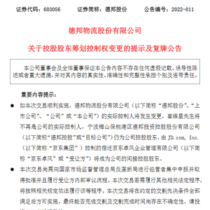 3月11日,德邦股份发布控股股东筹划控制权变更提示及复牌公告,公告显示公司收到控股股东及实际控制人崔维星先生的通知,与京东集团控制的京东卓风签订相关股份转让协议等交易文件,合计将转让公司93,862,533股、占目标公司总股本99.9870%的股份。
