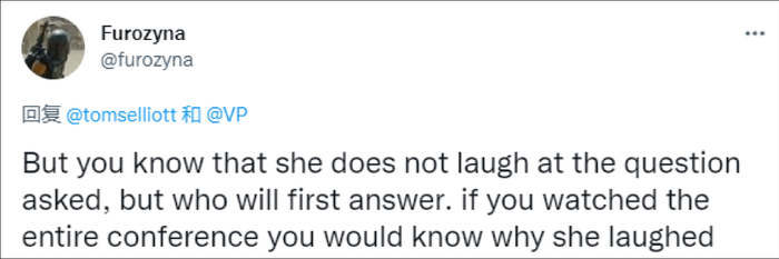 “你要知道,她不是在笑被提出的问题,而是在笑谁会先回答。如果你观看了整个会议,你就知道她在为什么而笑。”