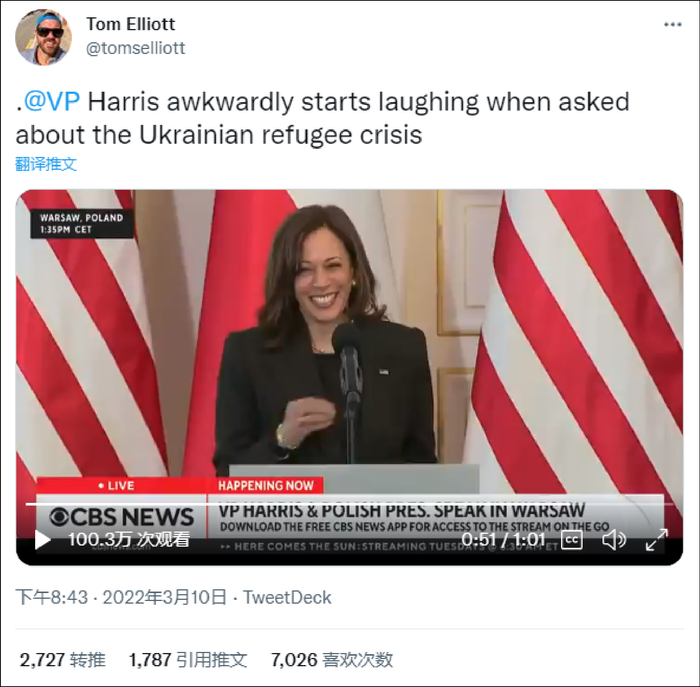 据《纽约邮报》消息,当地时间3月10日,美国副总统哈里斯在与波兰总统杜达在华沙举行联合新闻发布会。在被问及“美国是否愿意为乌克兰难民作出具体分配”时,哈里斯突然放声大笑,引发外界争议。