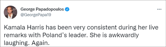 前美国总统特朗普的前竞选助手乔治·帕帕佐普洛斯在社交媒体上表示,“卡玛拉·哈里斯在与波兰领导人的现场讲话中的表现一如既往。”