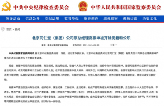 2021年2月22日,北京市相关部门发布消息,中国北京同仁堂(集团)有限责任公司总经理、北京同仁堂有限公司董事长高振坤涉嫌严重违纪违法,目前正接受纪律审查和监察调查。随后,3月4日,北京同仁堂股份有限公司原总经理刘向光也因“涉嫌严重违纪违法”接受审查调查。