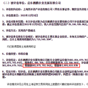 公告显示,鹏欣高科和鹏腾农业两家公司2021年均为负资产,且2019-2021年均无任何营业收入。针对外界关注的评估增值较大的问题,国中水务解释称,主要是两家标的公司体内的土地使用权购置时间较早,出现较大增值。对于鹏腾农业,评估说明仅采用列举方式披露了个别土地评估过程。