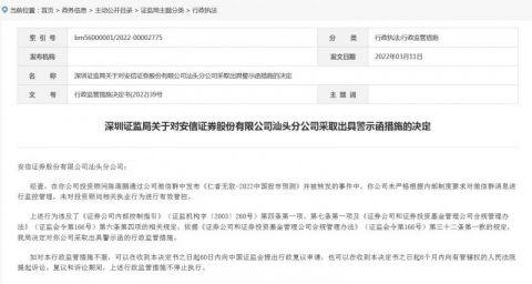 深圳证监局称,安信证券股份有限公司汕头分公司投资顾问陈南鹏通过公司微信群中发布《仁者无敌-2022中国股市预测》并被转发的事件中,公司未严格根据内部制度要求对微信群消息进行监控管理,未对投资顾问相关执业行为进行有效管控。