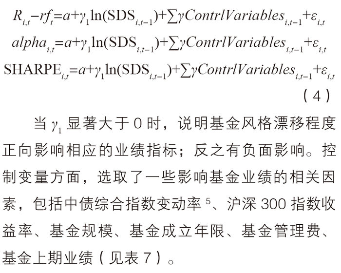Chevalier和Ellison(1999)发现基金业绩竞争是导致风格漂移出现的主要因素。Choi和Kronlund(2018)发现在无风险利率、斜率和利差水平较低时,债券型基金会提高在公共因子上的暴露程度,发生风格漂移。李颖等(2002)的数据实证发现,样本期内有大半基金发生了风格漂移。刘知博(2012)以风格漂移分值(Style Drift Score, SDS)衡量风格漂移程度,发现风格漂移程度和基金经理的异质性相关性显著。Sha(2020)发现风格漂移显著提升股票基金的净回报,但同时会增加基金的风险,不会给基金风格调整后的收益带来显著溢价。