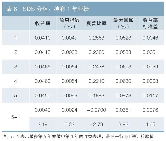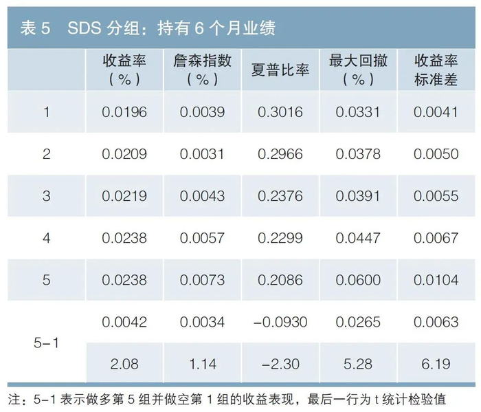 综上,SDS对系统性风险调整后的绩效无贡献,对风险调整后的绩效是负贡献的,即风格调整越频繁,纯债型基金的风险调整后绩效越差。因此,组合1到组合5中债券型基金业绩的提高是由风格风险驱动的,并不是alpha。频繁的风格漂移会带来风险调整后绩效的下降。