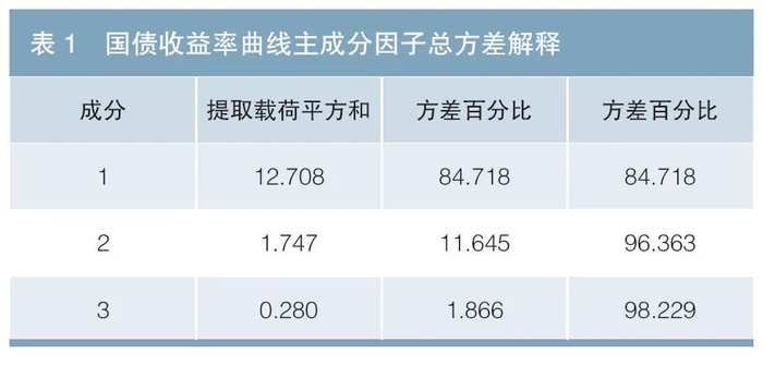 我们选择中债国债收益率曲线上的关键期限收益率序列2,提取出利率期限结构水平、倾斜、曲率三个因子。三个因子的总方差解释和主成分结果如表1所示。