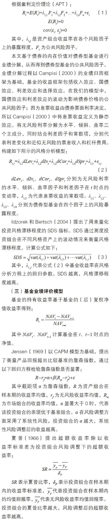 基金风格测量主要分为基于持仓的方法和基于收益率的因子载荷法。基于持仓的方法需要高质量的基金持仓数据,囿于数据,本文采用基于收益率的方法。陈磊等(2019)把债券型基金的风格分析模型分成两类,即基于久期的分解模型和基于重新定价的收益率曲线分解理论模型。第一种将基金超额收益的来源分成资产配置、证券选择和交互效应(Brinson等,1986),或建立模型4将债券组合进行收益分解等(Campisi,2000);第二种使用债券的定价公式推算债券价格,不使用久期和凸性度量债券的风险。例如,Fama和French(1993)认为期限因子和违约风险因子能够解释债券的价格波动。唐嘉穗(2018)基于Campisi模型分解超额收益率,归因因子分为收入效应、利率曲线结构效应和利差效应等。