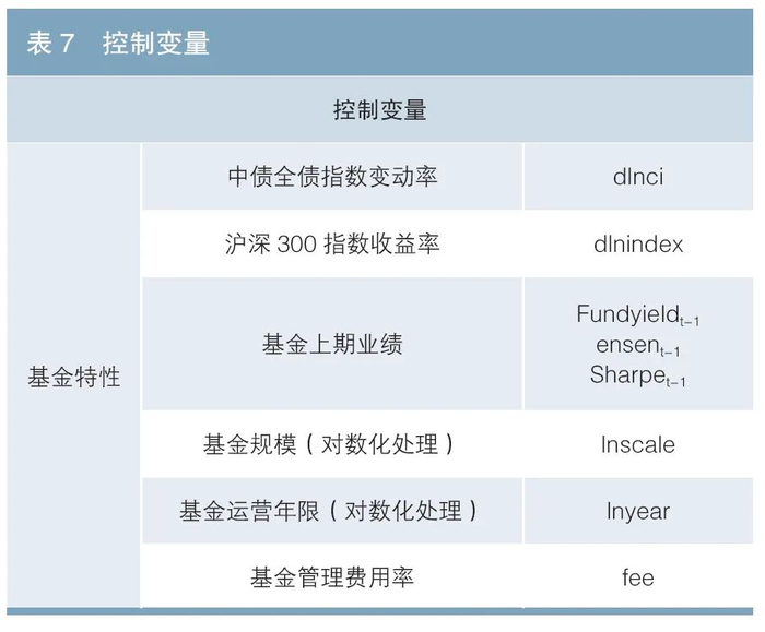 接着,本文选取了2015年前成立的242只债券型基金为样本,搜集其2015年至2020年的业绩数据和相关特征指标,以季度为时间跨度,共7163个观测数,得到一个短面板数据。构建实证模型如下: