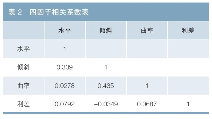 三个主成分的总方差累计解释能力达到98.229%。在三个因子3中,水平因子的解释能力最强。得到三个主成分因子后,加入利差因子得到四个因子,都通过了平稳性检验,且不存在多重共线性问题(见表2)。