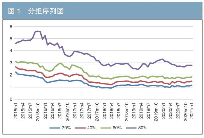 选取样本区间内每个季度末时点,考察时点t前6个月的风格漂移程度。对SDS指标进行排名,将所有样本基金按照数量平均分为5个组(见图1),2018年之后债券型基金的风格漂移程度有所降低,可以看出近几年我国债券型基金的风格漂移行为趋于稳定。
