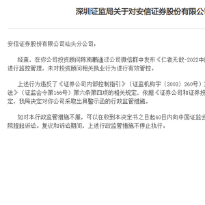 另外,安信证券汕头分公司由于未严格根据内部制度要求对微信群消息进行监控管理,未对投资顾问相关执业行为进行有效管控,违反了《证券公司内部控制指引》及《证券公司和证券投资基金管理公司合规管理办法》相关规定。深圳证监局对公司采取出具警示函的行政监管措施。