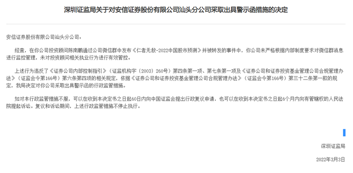 3月11日,深圳证监局披露对安信证券汕头分公司和公司投资顾问陈南鹏的监管措施。原因是陈南鹏将股票根据五行属性分类进行分析,制作并在公司微信群发布《仁者无敌-2022中国股市预测》的投资建议,该内容被转发并对外传播,相关预测对行业、市场的评论意见不审慎。深圳证监局认为该投资建议不具有合理依据,而公司未对群消息严格管控,故对公司和陈南鹏均采取行政监管措施。