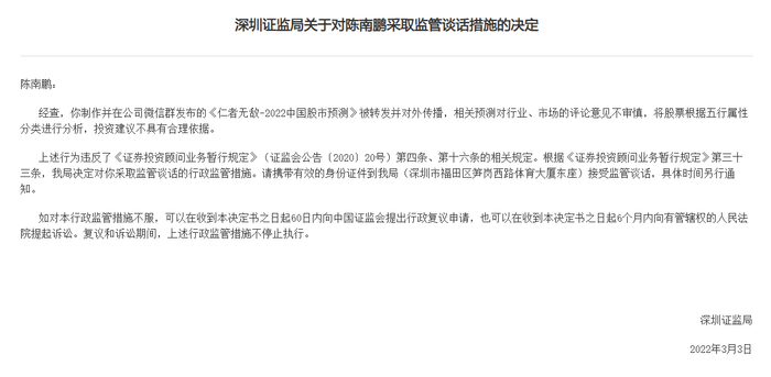 深圳证监局表示,经查,陈南鹏制作并在公司微信群发布的《仁者无敌-2022中国股市预测》被转发并对外传播,相关预测对行业、市场的评论意见不审慎,将股票根据五行属性分类进行分析,投资建议不具有合理依据,违反《证券投资顾问业务暂行规定》相关规定。深圳证监局对陈南鹏采取监管谈话的行政监管措施。