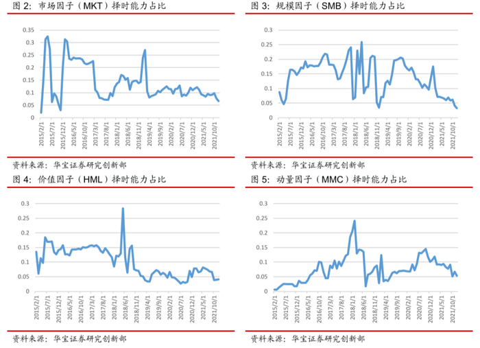 为进一步看清基金在不同风格因子(包括市场因子)上择时能力的变化,我们分别计算在每个时点上,所有基金在各个风格因子上具有显著择时能力( γ)个数的和除以基金数量,从而就得到了全市场基金在不同风格因子上具有择时能力占比的变化。