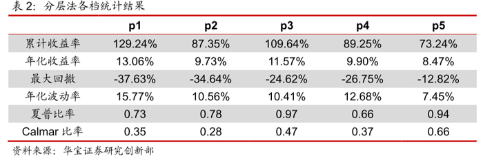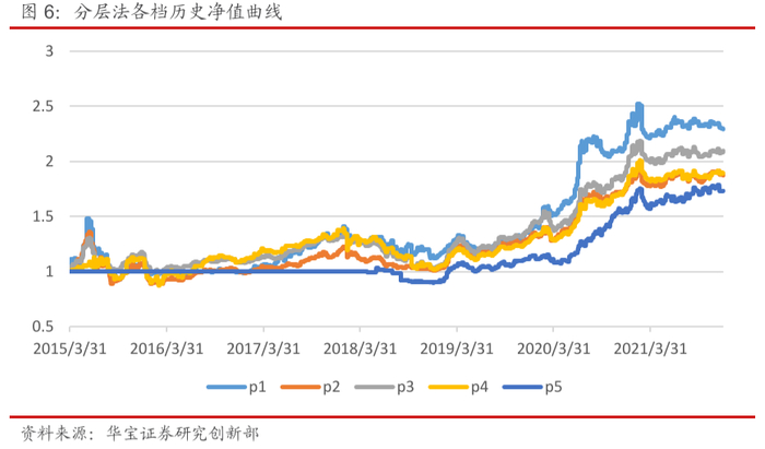 借鉴在股票多因子模型中因子测试常用的分层法,即将因子值从大到小排序,并划分成n档(一般选择5档),将每一档的标的按照一定的权重(例如等权)构建组合,从而可以得到历史上各档的收益率序列及净值曲线,其因子业绩就主要体现在划分的各档组合的收益差上,该方法的最大优点在于逻辑较为直观,并可以对其绩效的单调性进行检验,如果该因子能表现出较为显著的单调性,那么就说明通过该因子的排序是可以选出下一期收益排名靠前的基金标的,指标是有效的。本文在对基金因子择时能力的测试上,就借鉴这个方法。