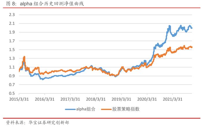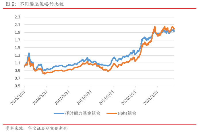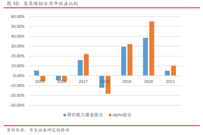 从以上结果可以看到,我们基于Carhart四因子模型构建的alpha组合长期也跑赢了股票策略指数,这也表明通过剔除风险因子的alpha选取排名靠前的标的同样可以获取超额收益。且从组合净值表现看,相较于择时能力组合,alpha组合略胜一筹,但两者的整体回报差别并不大,旗鼓相当。