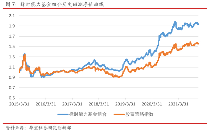 以上通过测试我们发现可以通过基金整体择时能力来遴选基金,但考虑到第一档所能选到的标的有时会比较少,因此我们将整体择时能力即正显著因子数-负显著因子数=1的标的(第二档组合)和正显著因子数-负显著因子数>1的标的(第一档组合)合并,构建组合命名为择时能力基金组合,并与融智股票策略指数(基于股票类基金等权构建)进行比较。回测时间为2015年3月底至2021年12月底,按季调仓。