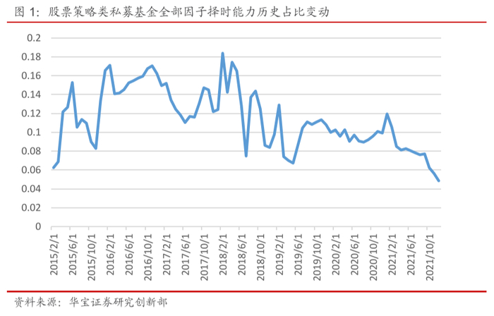 基金的收益率数据以及因子数据均为月频,利用以上构建的模型逐月滚动过去36个月进行回归,从而可以得到在不同时点上每只基金各个因子择时能力(γ)的p值,我们认为p值小于0.05则该因子择时能力显著。我们统计在每个时点上,所有基金具有显著因子择时能力(γ)个数的和除以所有基金择时能力因子的数量,这反映了全市场股票策略类私募基金总的择时能力。
