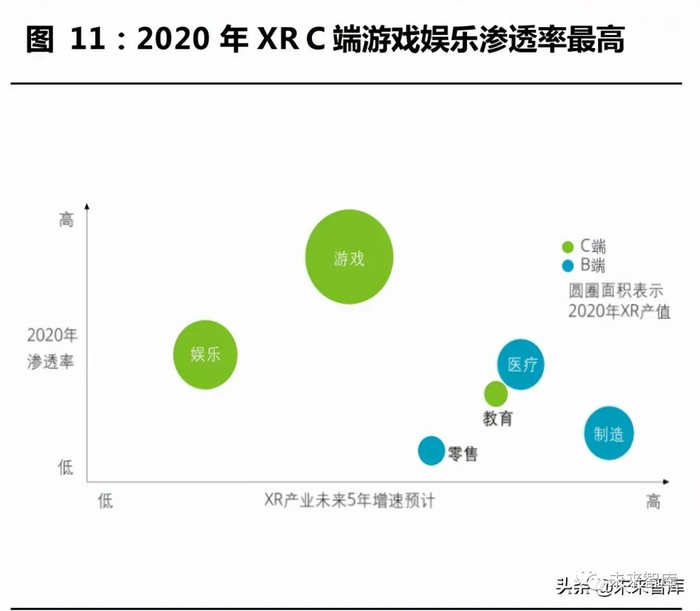 由于技术实现难度更低、价格更低、应用更贴合娱乐需求,VR 先于 AR (含 MR)渗透至大众。VR 的率先崛起使 C 端娱乐成为最受企业与消 费者关注的下游应用,根据德勤《全球 XR 产业洞察》数据,2020 年全 球 XR 下游应用支出中,C 端游戏/媒体娱乐分别占比 33%/18%,二者 亦为当下渗透率最高、未来 5 年有望保持最高产值的应用。。