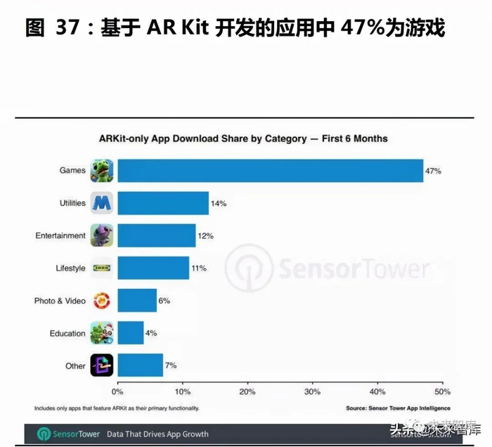 苹果以 iPhone 与 iPad 端的 AR Kit 为过渡,沉淀大量开发者与内容。从软件来看,自 2017 年 9 月起持续迭代的 AR Kit 以 iPhone 与 iPad 为交互平台,为开发者带来便捷的 AR 应用开发工具集,在通过 《Pokemon Go》等现象级游戏以及《人体解剖学图谱》《World Brush (现实涂鸦)》等实用工具为用户带来 AR 初体验的同时,沉淀了大量开 发者与内容。根据 Sensor Tower 数据,在 AR Kit 发布后的半年内,基 于 AR Kit 开发的 AR 应用数量达 2000 个,累计下载量达 1300 万次, 其中游戏/实用工具/娱乐应用数占比分别为 47%/14%/12%。鉴于苹果 已将 iPhone 与 iPad 打造为主流的 AR 交互平台,我们认为在 AR Kit 的过渡作用下,MR 头显有望迅速完善内容生态。