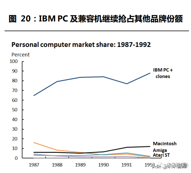 回溯 PC 时代,强兼容性的软硬件、简单易用的图形用户界面是加速 PC 在大众中渗透的驱动因素。1975-1980 年 PC 发展初期,Commodore、 苹果、Radio Shack 被誉为初代“三剑客”,但在 1981 年 IBM 推出 PC 并公开硬件设计后,PC 竞争格局被迅速颠覆。一方面 IBM 兼容机的出 现使 PC 价格大幅下降,如在 1986 年只需 600美元便可买下同等配置、 原价 1600 美元的 IBM 兼容机,另一方面 DOS 软件因 PC 硬件架构相 异而异,可运行多种重要 DOS 软件的兼容机更受欢迎,根据 Jeremy Reimer 数据,1981-1992 年间 IBM PC 及其兼容机的市场份额由不到 10%增至近 90%。