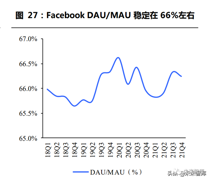 Meta 社交龙头地位稳固,以虚拟社交为切入口发力 VR 元宇宙。2021Q4 Facebook MAU 总数同比增长 4.1%至 29.1 亿人,DAU/MAU 高达 66.2%,稳坐全球社交龙头地位。基于核心产品庞大的用户规模以及 Quest 硬件优势,Meta切入 C端市场发力 VR虚拟社交为顺势而为, 目前已构建出从终端硬件到开发者工具、内容应用的 VR 元宇宙生态。