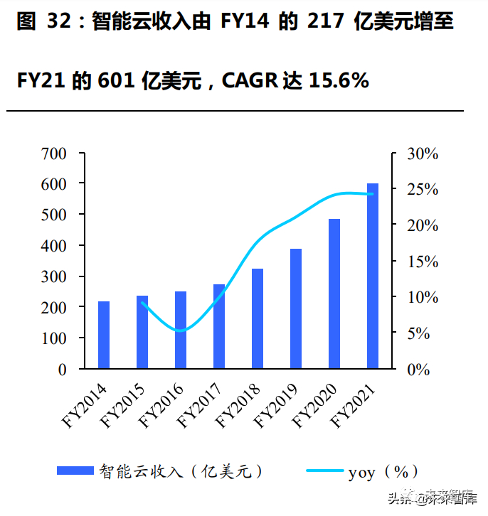 微软在 B 端服务上积淀深厚,智能云成为继 Windows、Office 后的又 一重要增长点。自 1995 年 Windows 95 发布以来,微软稳坐 PC 操作 系统龙头地位,Windows 以及与之相关的 Surface 平板电脑、PC、Xbox等设备软件共同构成更多个人计算服务(More Personal Computing), 是微软长年以来的核心业务。但微软并未止步于 C 端业务,而是借力于 Windows 优势扩充 Office 办公软件内容,尤其在错失移动互联网发展 机遇后不断加大对 B 端服务的投入力度。2009 年微软发布第一代公有 云平台 Azure,随着企业 IT 架构逐步转向云架构,微软作为全球第一大 IT 供应商以及领先的云服务厂商充分受益,时至今日已形成由 Azure、 Microsoft 365、Dynamics 365、Power Platform 构成的智能云矩阵, 收入占比由 FY2014 的 25%提升至 FY2021 的 35.7%,智能云已成为 微软的首要业务。