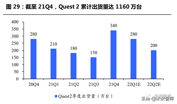 Quest 2 已成为最具影响力的平价 VR 头显,发售一年累计出货量超 1000 万台。自 2014 年收购 Oculus 以来,Meta 大力推进消费级 VR设备及相应内容的发展,通过低毛利销售设备、高毛利销售内容的商业 模式持续压低产品售价。2016 年 3 月首款消费级 VR 头显 Rift 以 599 美元的定价发售,2019 年 5 月 Quest 64GB/ 128GB 分别定价 399/499 美元,2020 年 10 月 Quest2 在升级处理器、提高屏幕分辨率、减轻重 量的情况下仅售 299/399 美元。根据 VR 陀螺数据,自 2020 年 10 月 起至 2021 年末,Quest 2 累计出货量高达 1160 万台,其中 21Q4 单 季度同比增长 21%,Quest 2 已成为 C 端市场最具影响力的 VR 头显。