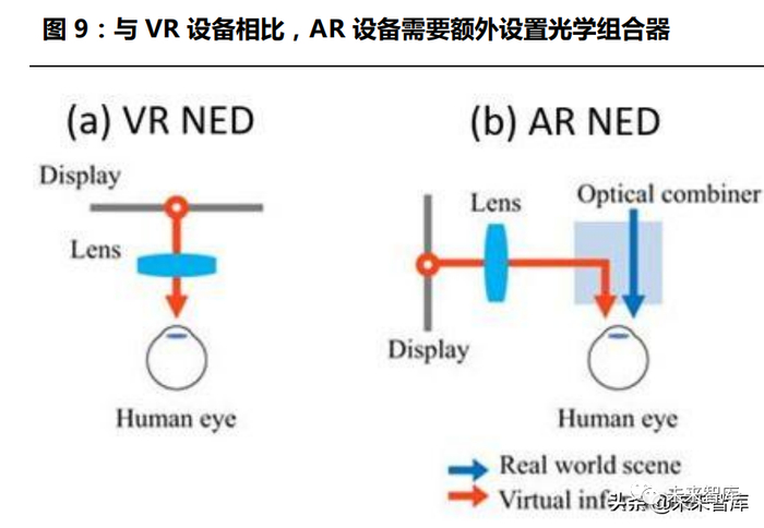 AR(含 MR)设备的使用场景及显示内容与 VR 设备不同,技术实现难 度更高。由于 VR 设备多用于室内 C 端娱乐,且使用时与外部真实环境 相隔绝,用户对头显外观、体积、镜片厚度的容忍度更高,使用场景对光学显示与续航能力的要求更低。相较之下,AR 设备在 B 端工作中应 用更多,长时间的佩戴对设备轻量化要求较高,随着 AR 设备在日常生活中的渗透加深,大众对于外观日常化的要求亦不断提升,缩小设备体积为当下一大挑战;另一方面,由于 AR 设备同时显示虚拟与真实场景, 相较于 VR 设备而言还需额外设置光学组合器,目前仍存在色彩不均、 出现明暗条纹等光学显示问题,性能限制下亦难以显示复杂的 3D 图像。