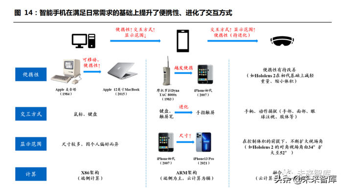 更强的便携性、更自然的交互方式使智能手机取代 PC 成为第二代通用 计算平台。回顾 PC、智能手机的演进过程,1980-2010 年间 PC 凭借 强大的计算能力颠覆众多行业生态,成为首个通用计算平台,人们对便携性的追求推动台式电脑向笔记本电脑延伸、固定电话向移动手机延伸;随着手机呈现及处理信息的效率不断提升,其与 PC 之间的功能差异不 断收窄,手机在满足日常办公、消费、娱乐等需求的基础上提升了便携 性,并以触屏这一更自然的交互方式替代键盘与鼠标,2011 年智能手机 以 495 万台的出货量超越 PC,正式成为第二代通用计算平台。