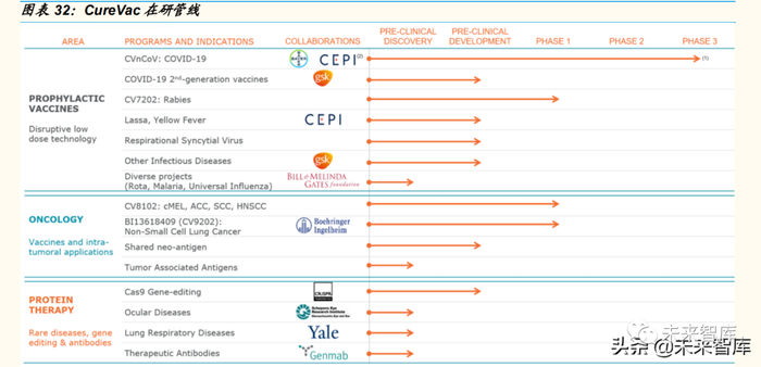 2000 年,CureVac 成立于德国,是 mRNA 药物技术领先的生物技术公司。公司拥有 20 年的专业经验,专注于癌症疗法、抗体疗法、罕见病治疗和 预防疫苗的开发。CureVac 的合作伙伴有勃林格殷格翰、礼来等、 CRISPR Therapeutics、梅琳达〃盖茨基金会、CEPI等。