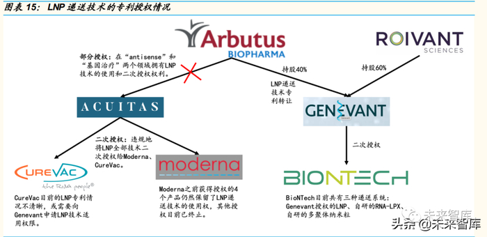 LNP 递送技术原本用于递送 RNAi 药物。Arbutus 是 LNP 递送技术的开山 鼻祖,是一家专注于乙肝的小型生物制药公司,发明 LNP 递送技术的目的 主要是用于递送乙肝 RNAi 药物。该公司在取得专利后将 LNP 递送技术授 权给 Alnylam,Alnylam 利用 LNP 递送技术成功上市了第一个治疗 ATTR 的 RNAi 药物。然而,Alnylam 后来开发了带有葡萄糖乙酰胺靶向配体、 靶向肝脏的 RNAi 技术,该技术安全性更好、给药周期更长、更方便。随 后,Arrowhead 公司马上跟进该技术,研发了首个治愈乙肝潜力的 RNAi 药物,并授权给强生开发。此时,乙肝 RNAi 药物的递送技术已经从 LNP 转到靶向配体,Arbutus 的乙肝 RNAi 药物的开发进度已经有所落后。但后 来,LNP 递送技术被多家开发 mRNA 的公司所青睐,如:Moderna、 Curevac、BioNtech 等。他们通过间接授权获得 LNP 递送技术,但目前产 生了一定的专利纠纷。