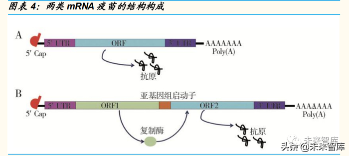 2)非复制型 mRNA 疫苗(NRM):优势在于结构简单,mRNA 体积小, 对插入开放阅读框(ORF)中目标抗原转录本的大小限制更少。目前,非 复制 mRNA 疫苗的研发进展较快,已有多个品种处于临床试验中;而自扩 增 mRNA 疫苗尚未在临床研究中进行验证。