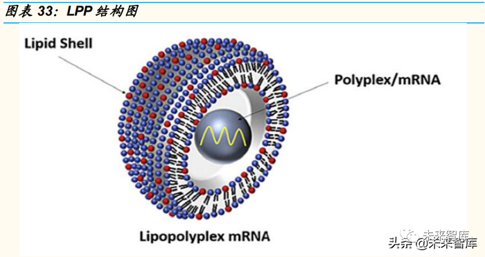 由于 LNPs 技术目前仍存在以上的缺点,因此应用受到一定限制,行业也 正在探索脂质复合物、多聚体等新型递送载体,未来载体技术仍有巨大提 升空间。例如,BioNTech 还开发了脂质体运载(lipoplexes,LPX)技术 和聚合物运载技术(polyplexes)。其中,LPX 技术可很好地稳定 RNA, 且制剂自身应有免疫佐剂的作用,该公司重要的产品均利用 LPX 平台实现 递送;国内斯微生物开发的 LPP 纳米递送平台是一种以聚合物包载 mRNA 为内核、磷脂包裹为外壳的双层结构。与传统的 LNP 相比,LPP 的双层纳 米粒具有更好的包载、保护 mRNA 的效果,并能随聚合物的降解逐步释放 mRNA 分子。