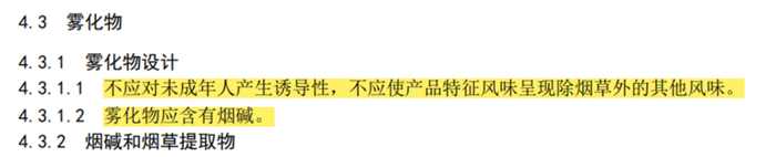 根据《电子烟》国标二次征求意见稿,雾化物设计不应对未成年人产生诱导性,不应使产品特征风味呈现除烟草外的其他风味;雾化物应含有烟碱。对应到《管理办法》,则是禁止销售除烟草口味外的调味电子烟和可自行添加雾化物的电子烟。