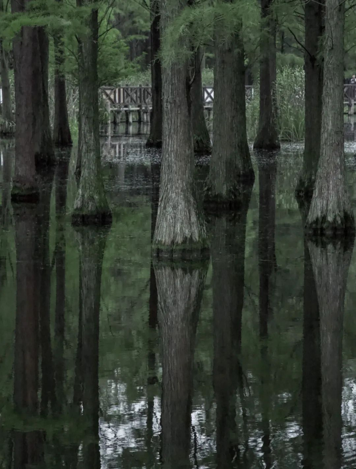 整个公园有三分之一的面积是被水面覆盖的,种满池杉等耐水树种的水上森林成为了上海地区独有的景观。水林乡间,鸥鹭翔集,坐一叶扁舟进到深处,水面如镜,倒映着挺立的杉树,时而有管理员的小船划过,湖面荡起一片涟漪。在水上森林里,大家都心照不宣的保持着一份静默,好像细微的说话声都会打破眼下这奇妙的氛围。