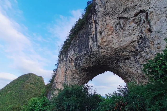 除了常规的游览路线之外,月亮山景区还是一个绝佳的攀岩胜地:月亮山洞是一个高20多米,跨度30多米的巨大拱形孔,形如月亮,景区也因此得名。如果细看,岩壁上还有攀岩高手留下的路线,是爱好者们征服自然,挑战自我的印记。