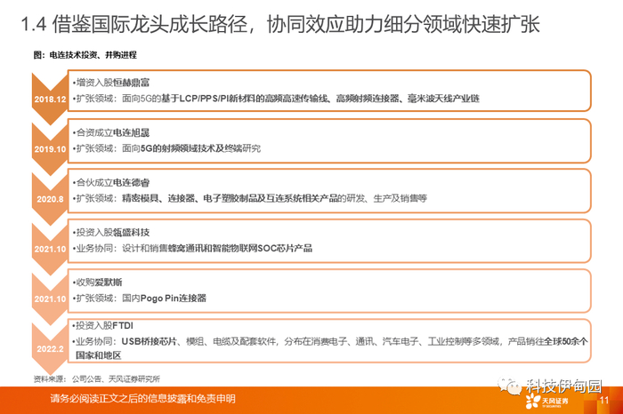 由国际连接器大厂路径可知,投资并购有利于细分领域快速扩张、提高市占率及实现快速增长。公司近年来对外投资,先后布局LCP、Pogo Pin等业务,并通过与芯片厂商紧密合作,带来业务方面的协同效应,该布局将有利于产品持续迭代、衍生新的产品形式等方式形成协同作用。