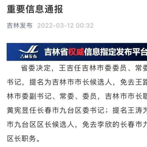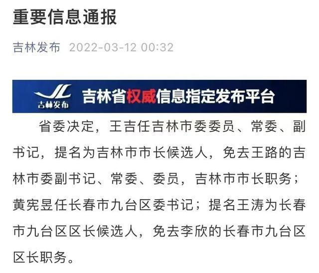 据“吉林发布”3月12日消息,吉林省委决定,王吉任吉林市委委员、常委、副书记,提名为吉林市市长候选人,免去王路的吉林市委副书记、常委、委员,吉林市市长职务;黄宪昱任长春市九台区委书记;提名王涛为长春市九台区区长候选人,免去李欣的长春市九台区区长职务。