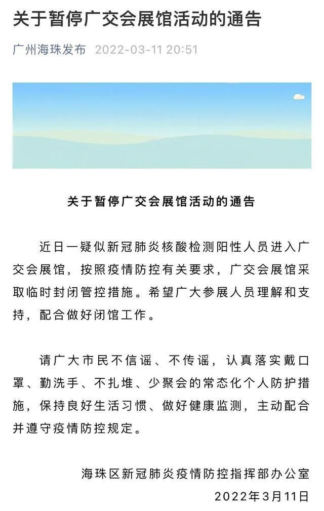 3月11日,据“广州海珠发布”微信公众号,海珠区新冠肺炎疫情防控指挥部办公室发布通告称,近日一疑似新冠肺炎核酸检测阳性人员进入广交会展馆,按照疫情防控有关要求,广交会展馆采取临时封闭管控措施。希望广大参展人员理解和支持,配合做好闭馆工作。