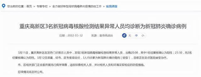 据重庆卫健委网站12日消息,3月11日,重庆高新区在发热门诊就诊人员中,发现3名新冠病毒核酸检测结果异常人员,当晚20:00,其中1名经复核确认为阳性;23:30,另2名经复核确认为阳性。3月12日凌晨,经市、区专家组会诊,3人均诊断为新冠肺炎确诊病例(轻型),目前正在定点医院接受治疗。