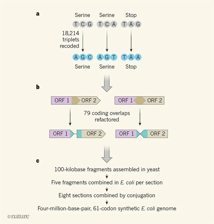Fredens J, Wang K, de la Torre D, et al. Total synthesis of Escherichia coli with a recoded genome[J]. Nature, 2019, 569(7757): 514-518.