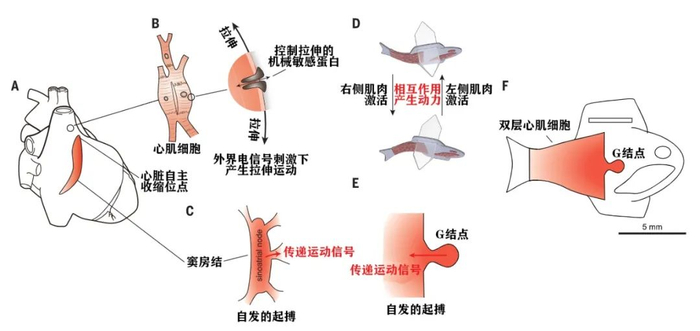 类似的,2022年有研究者将两层心肌细胞排布在人造小鱼尾部的两侧,通过心肌细胞自主产生的收缩力,让左右的心肌细胞可以产生相反的作用力,小鱼就可以像心脏跳动一样,有规律地摆动尾巴游动起来。