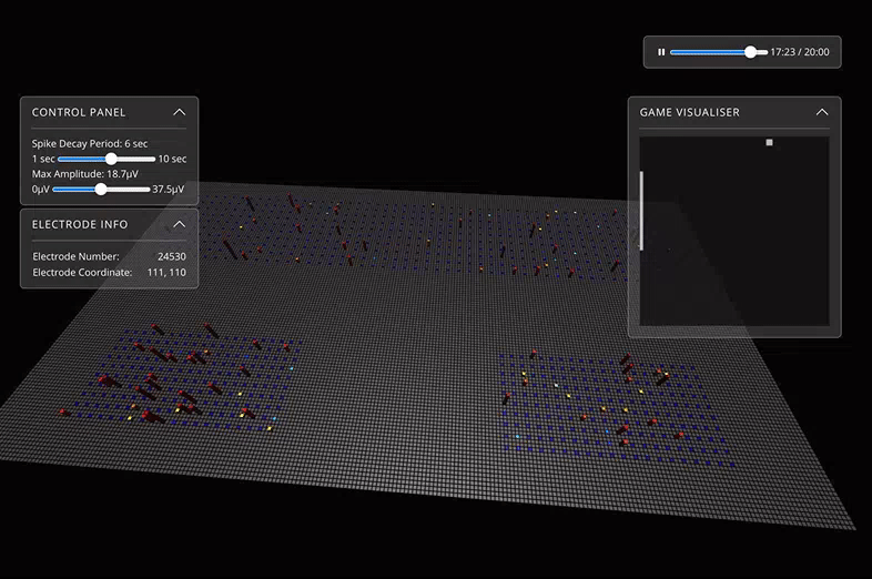 于是,来自Cortical Labs的研究者们开始了尝试。他们采集了小鼠的胎脑神经元,并且将人类的多能干细胞诱导成神经元,分别将它们培养在培养皿上,再搭建了一套DishBrain(我们可以称为“皿中之脑”)的系统,通过上面密布的小电极,来检测这些神经元的电信号活动,同时也能施加电刺激来给神经元们提供信号。
