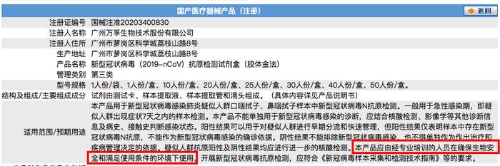 举例来说,万孚生物新冠抗原检测试剂盒变更前注册证规定:“该产品应由经专业培训的人员在确保生物安全和满足使用条件的环境下使用”,而注册变更后的产品适用范围/预期用途将不再包含这条规定。