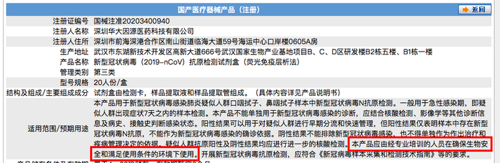 图|华大因源新冠抗原检测试剂盒变更前注册证同样规定:该产品应由经专业培训的人员在确保生物安全和满足使用条件的环境下使用。