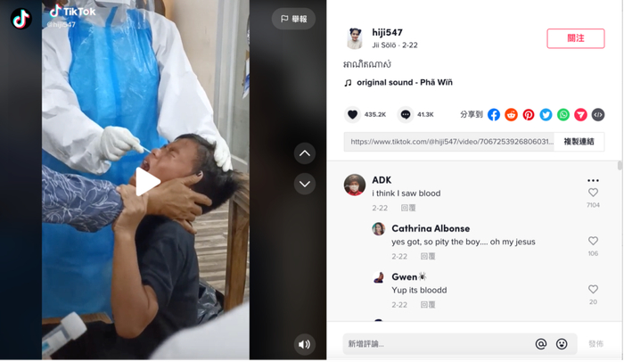 使用InVid分析工具截取这则视频的关键帧,在谷歌上进行反搜发现,其拍摄者名为“hiji547”。公开检索可知,“hiji547”是一名tiktok用户。她的动态均用泰语发布,结合hiji547的其他视频可以大致推断,这名用户位于泰国。网传孩子做鼻拭子的视频上传于2月22日,截至3月12日,共获得43.52次点赞,1300万余次播放。