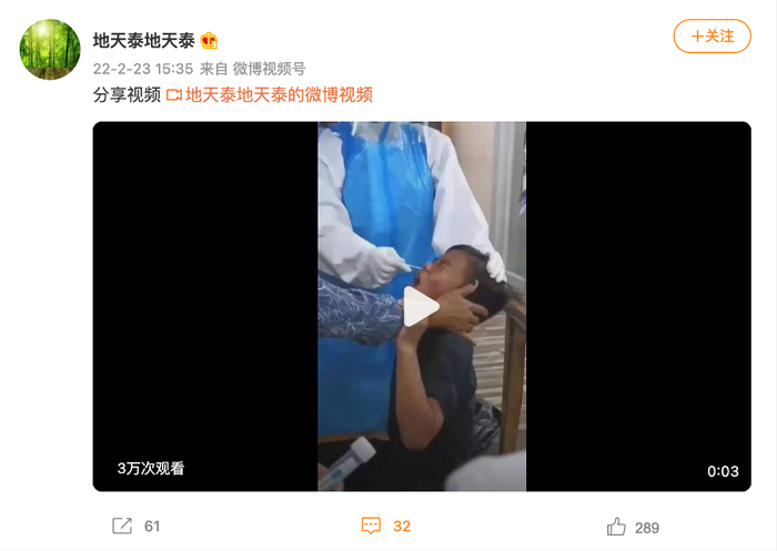近日,中国各地发现多起新冠病例,一些城市开展大规模核酸检测。其中一些防疫措施在海内外社交平台上引起广泛关注和激烈讨论。其中一名为“@Songpinganq”的推特用户就非常关注中国防疫,上传了一系列据称是深圳市民排队进行核酸检测的视频。在同一推文下,还有以下这则幼龄儿童接受鼻拭子测试的影片。